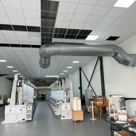 🔍 Pour une distribution optimale de l'air, nous utilisons un réseau de gaines suspendues avec des terminaux microperforés sur les lignes de production, respectant les normes de vitesse, d'émergence acoustique et d'homogénéité requises. Une étude approfondie des flux d'air ambiant et pulsé assure l'efficacité et l'économie de notre système de ventilation.
