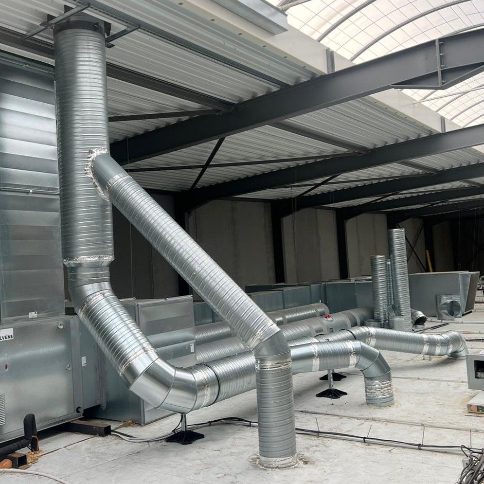 L'air humide est ensuite acheminé vers une tourelle d'extraction en toiture, conçue pour évacuer l'humidité à l'extérieur du bâtiment sans réintroduction dans l'environnement de travail. Ce système garantit ainsi une régulation optimale du taux d'humidité ambiante, entraînant la formation de condensation sur les parois et les plafonds.