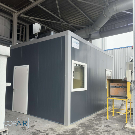 Composé de panneaux absorbant les nuisance sonores émises par la motorisation des machines, cet aménagement assure un environnement de travail plus calme et confortable pour le personnel du site📉.